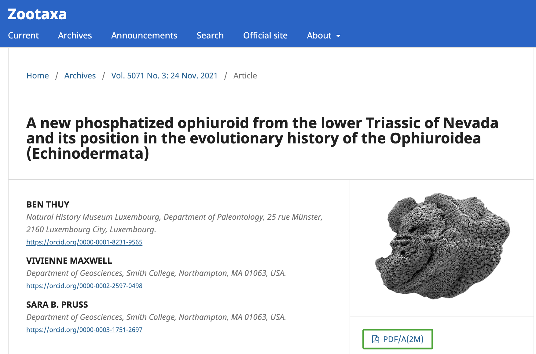 - Identified over 120 microfossils from Lower Triassic insoluble residues and analyzed the elemental composition, which resulted in the discovery of phosphatized fossils as well as a new genus and species of ophiuroids